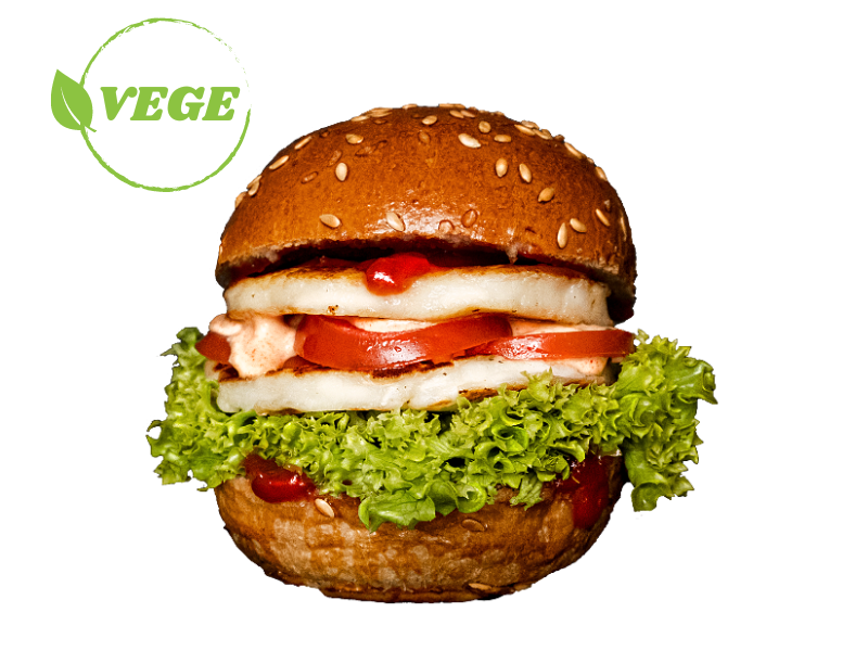 domácí houska, dvojitá porce grilovaného Halloumi sýru, rajčata, salát, kečup, original Chilli Mayo