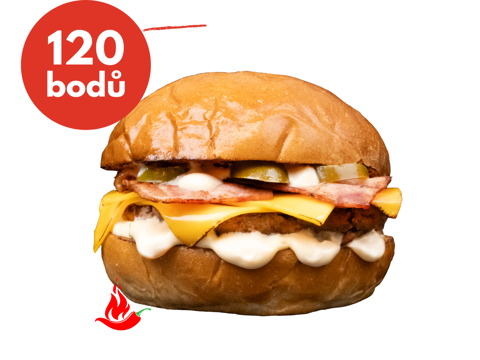 domácí houska, 120g hovězího masa, opečená slanina, extra porce čedaru, jalapeňo, original Mayo